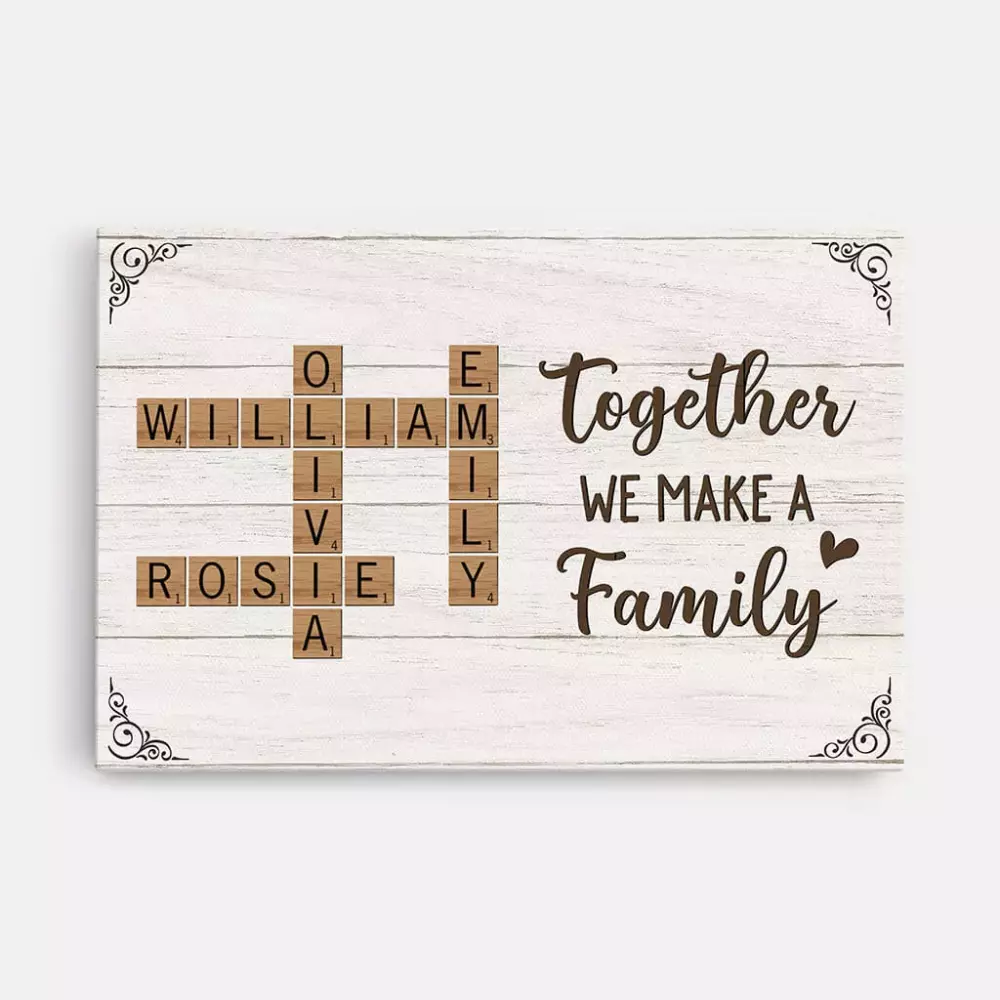 personalised the love between family is forever crossword canvas wall art;personalised family names street sign canvas 1;personalised together we make a family puzzle canvas;personalised the night we met star map canvas for couple;personalised you me we got this newsppaer canvas print for couple