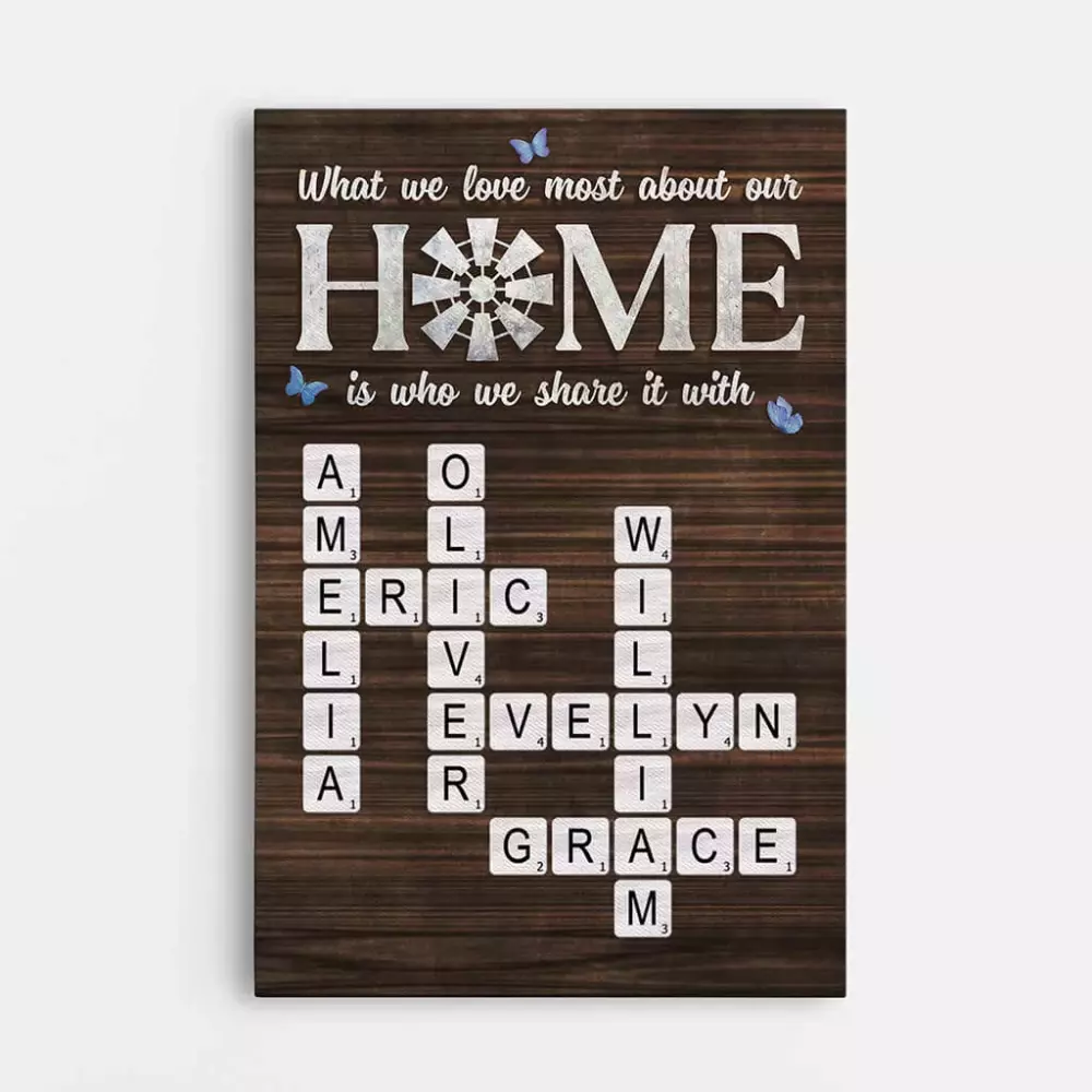 personalised to the world you are a mother crossword photo canvas;personalised what we love most about our home is who we share it with canvas for family;personalised family a little bit of crazy crossword canvas wall art 1;personalised the smith family under heart tree canvas 1;personalised to the world you are mum canvas 1