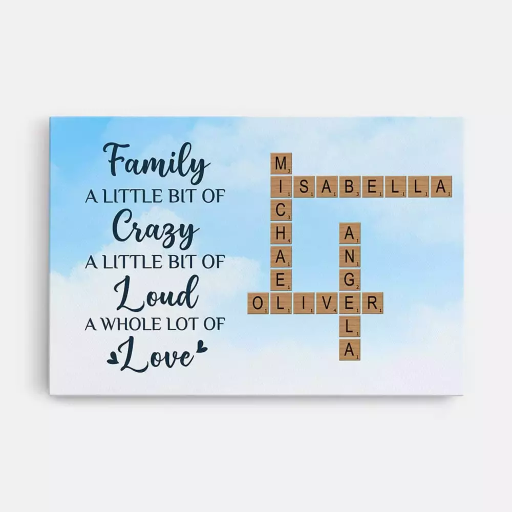 personalised you are my missing piece canvas for couple;personalised together we make a family crossword canvas 4;personalised family where life begins love never ends canvas;personalised we are a team photo canvas 1;personalised family a little bit of crazy crossword canvas